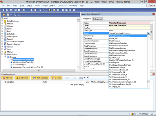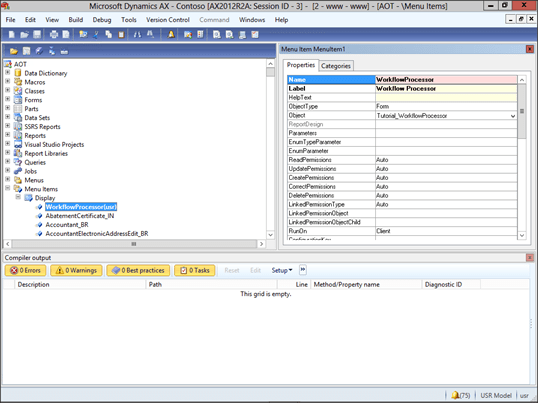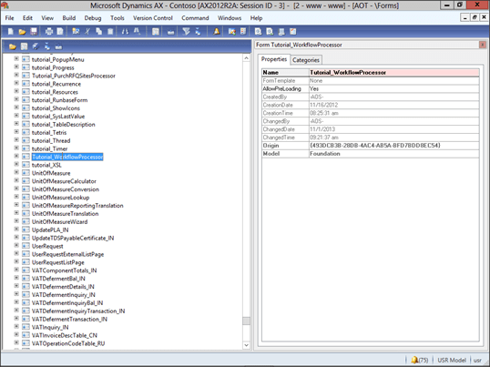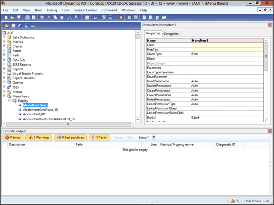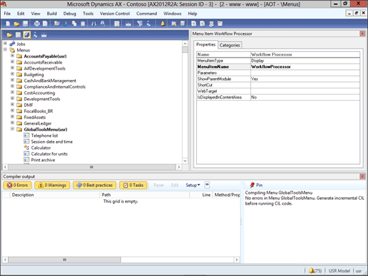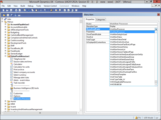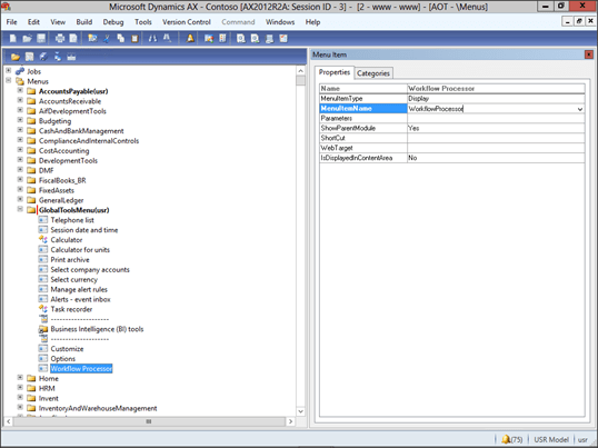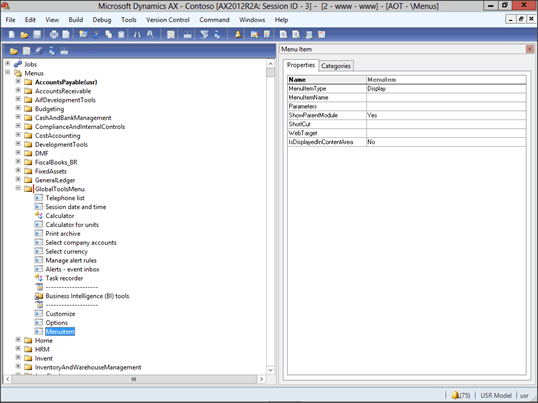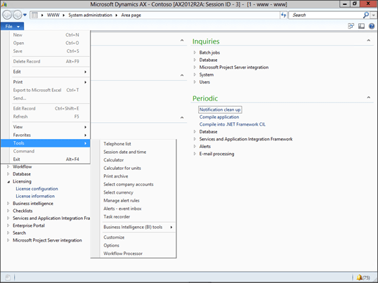 You probably know already that you can create your own menu items and menus within Dynamics AX, but in addition to being able to update the navigation menus for the area pages, you can also update the Tools menu as well to add any utilities and forms that you may want users to access. This way the users don’t have to have access to AOT in order to open up those common hidden utilities.