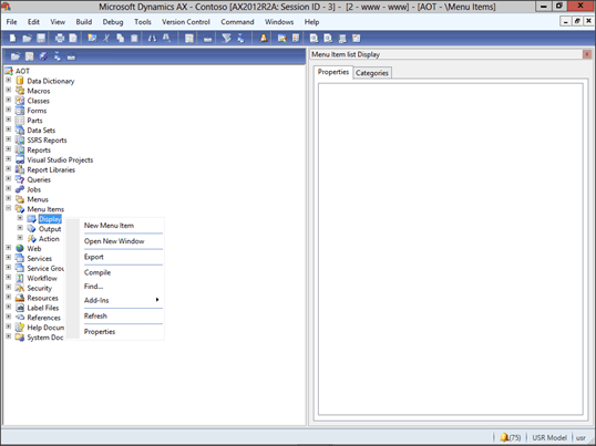 Now we will want to create a menu item for the form. To do this navigate to the Menu Items folder within AOT, right-mouse-click on the Display node, and then select the New Menu Item menu item.
