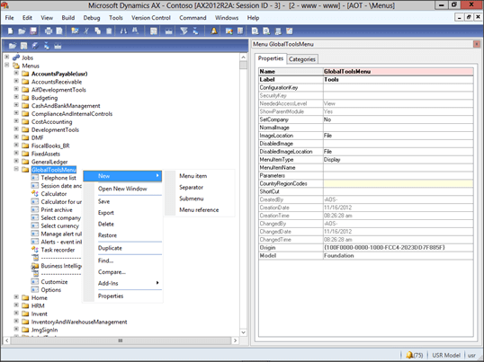 Now we want to add the menu item to the Tools menu. To do this, expand the Menus folder within AOT and find the GlobalToolsMenu item within the menus.